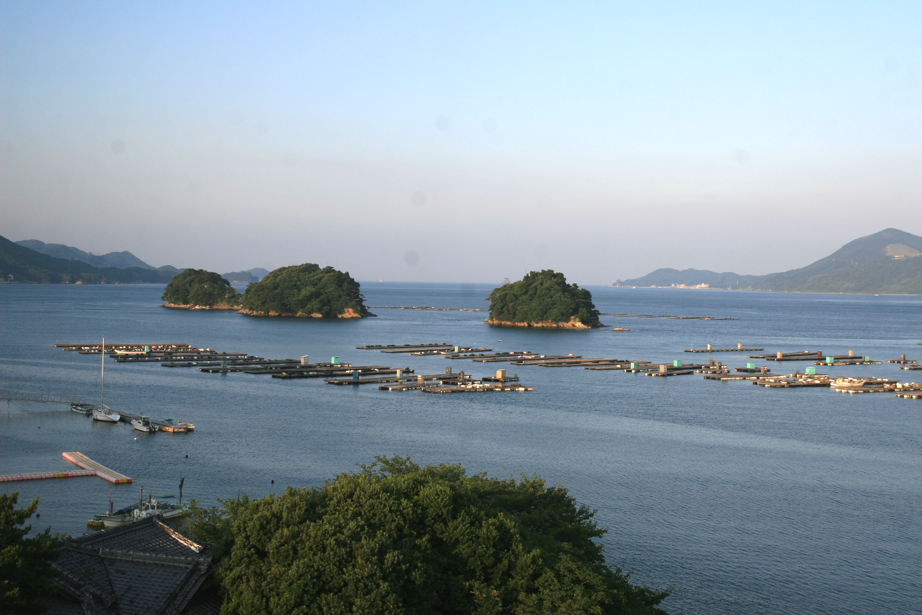 いかだが並んでいるのは真珠の養殖でしょうか。