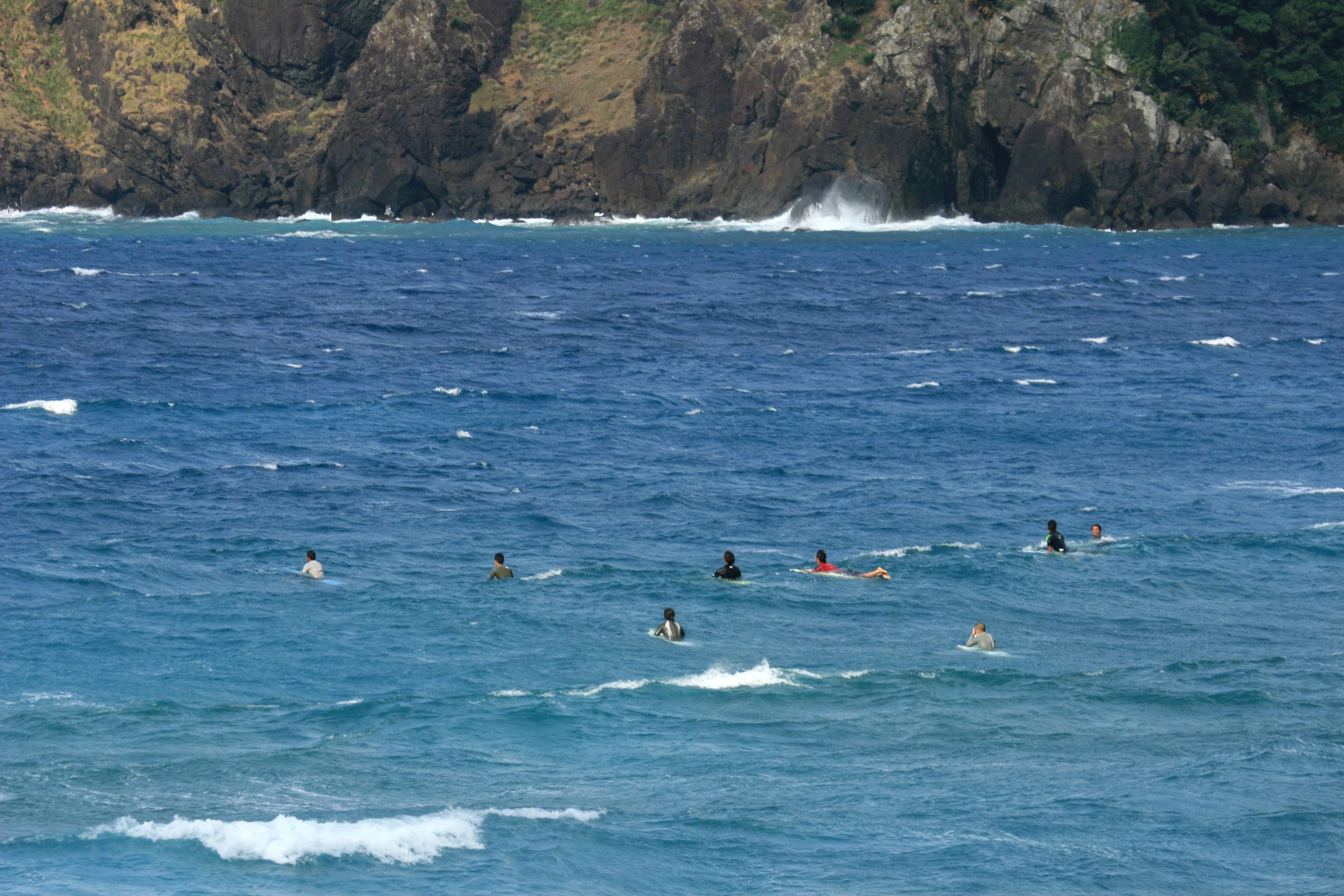 奥に岩場が見えて、波待ちのサーファーを斜めから撮影しています。