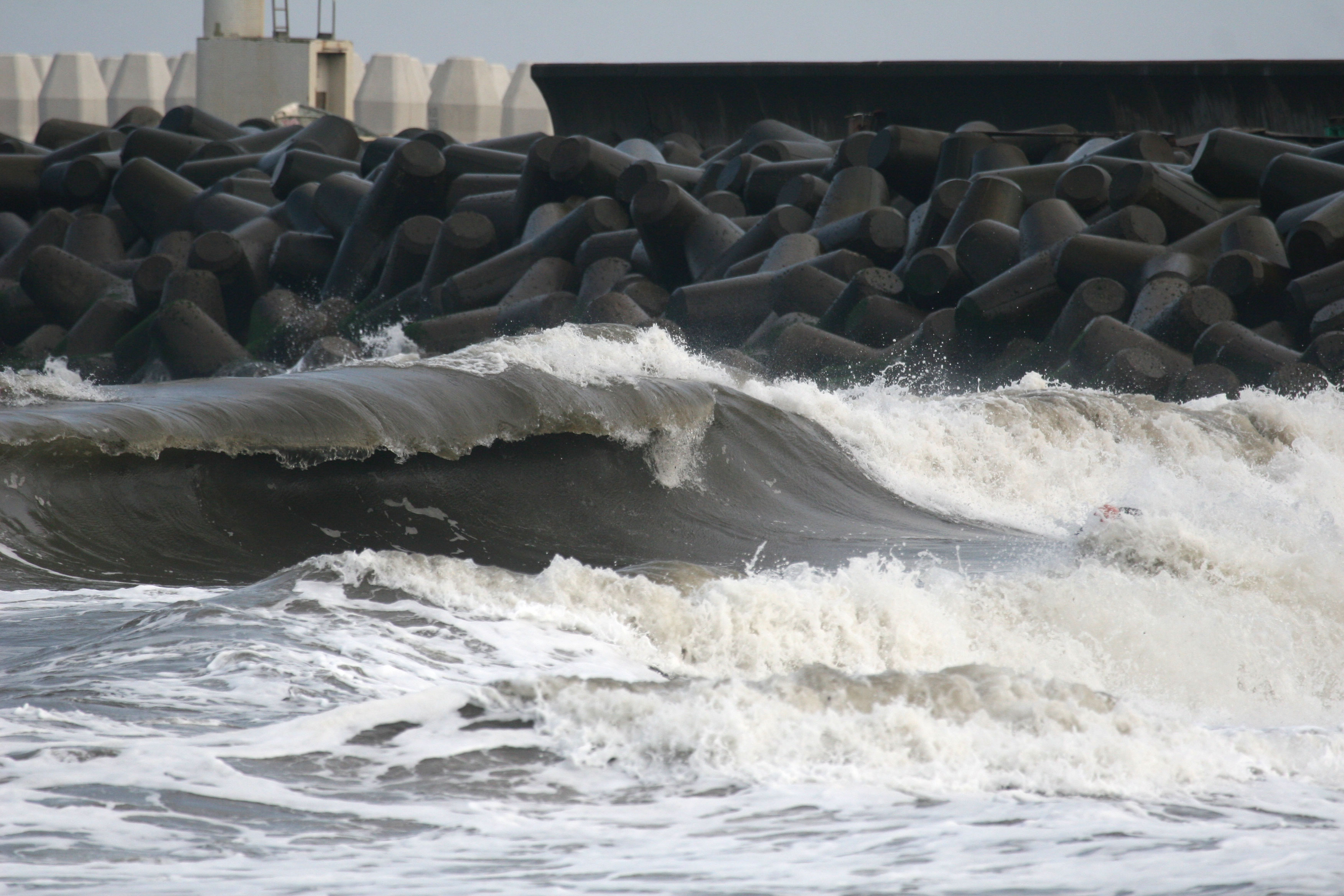 黒い色をした荒れた波と人口建造物のテトラが暗い雰囲気を出している。